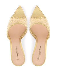 Rania 85mm crystal-embellished mules Speaking to the brand’s glamorous aesthetic, Gianvito Rossi’s Elle sandals feature a curved front strap embellished with smatterings of crystals. They're crafted from gold-tone leather and sit atop a stiletto heel. Highlights - Gold-tone - Mesh panelling - Crystal embellishment - Branded leather insole - Open back - Pointed open toe - High stiletto heel Made in Italy Composition Leather 100% SIZE & FIT Measurement HEEL 3.34 in(8.5 cm)