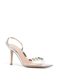 90mm Ribbon sandals Gianvitto Rossi's signature Ribbon sandals have a sleek minimalist silhouette that stands on an elegant stiletto heel. The design gets its name from the signature Ribbon buckle at the slingback strap. This iteration is presented in glossy silver leather, with colourful crystals for a playful touch. Highlights - Silver - Calf leather - Metallic effect - Crystal embellishment - Buckle-fastening ankle strap - Single toe strap - Square toe - High stiletto heel - Branded footbed Made in Italy Composition Sole: Calf Leather 100% Outer: Calf Leather 100% Lining: Calf Leather 100% SIZE & FIT Measurement HEEL 3.54 in(9 cm)