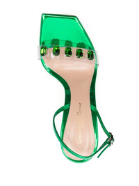 Ribbon Candy 105mm sandals Crafted in Italy from smooth leather, Gianvito Rossi's Ribbon Candy sandals are reimagined for SS23 in a bold green colour and metallic finish. Sitting atop a high stiletto heel, they boast a gemstone-embellished transparent strap at the toe. Highlights - Grass green - Calf leather - Metallic finish - Transparent strap - Gemstone detailing - Signature ribbon buckle fastening - Slingback strap - 105mm stiletto heel - Branded leather insole Made in Italy Composition Outer: Calf Leather 100%, PVC 100%, glass 100% Lining: PVC 100%, Calf Leather 100% Sole: Calf Leather 100% SIZE & FIT Measurement HEEL 4.13 in(10.5 cm)
