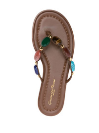 Shanti embellished leather flip flops Gianvito Rossi elevates these leather flip-flops with a touch of opulence – note the slender strap that’s adorned with mismatched gemstones. Highlights - Cognac brown - Leather - Bead embellishment - Gold-tone stud detailing - Thong strap - Round open toe - Branded leather insole - Leather outsole - Stacked heel Made in Italy Composition Outer: Calf Leather 100% Lining: Calf Leather 100% Sole: Calf Leather 100% SIZE & FIT Measurement HEEL 0.59 in(1.5 cm)