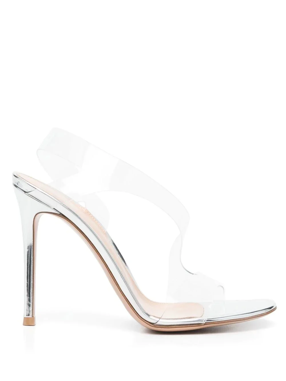 105mm Metropolis sandals Gianvito Rossi's Metropolis sandals showcase the wearers' feet through its transparent strapped design. Handmade in Italy, they've been artfully positioned to follow the natural curves of the foot. The 105mm stiletto heel works as a leg-lengthener. Highlights - Silver - Calf leather - Transparent strap - Open toe - Metallic effect - 105mm stiletto heel - Slingback strap Made in Italy Composition Outer: PVC 100% Lining: Calf Leather 100% Sole: Calf Leather 100% SIZE & FIT FittingInformation This piece fits small – take one size up Measurement HEEL 4.33 in(11 cm) Sole height 0.39 in(1 cm)