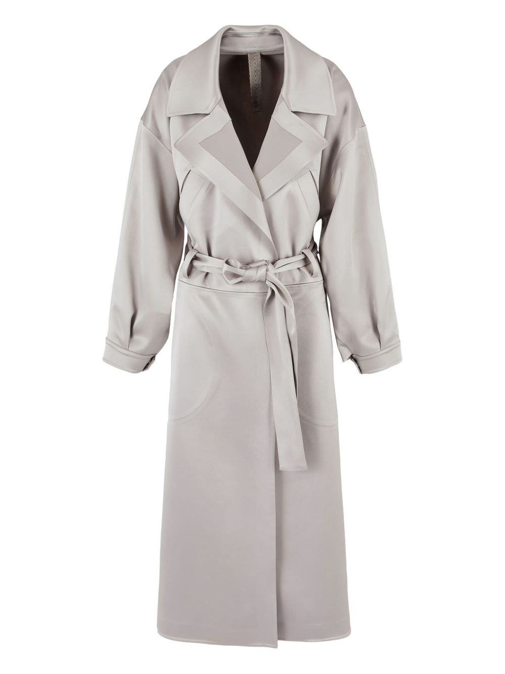 belted trench coat Highlights - Light grey - Belt - Long sleeves - V-neck - Front pockets - Lapel collar Made in Italy Composition Acetate 75%, Polyester 25%
