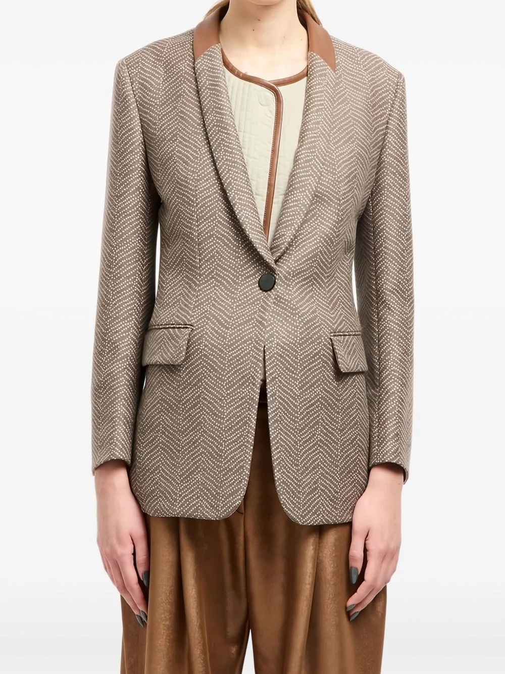chevron-jacquard single-breasted blazer Highlights - Beige - Virgin wool-cashmere blend - Lamb-skin collar detail - Button fastening - Front flap pockets - Long sleeve Made in Italy Composition Mulberry Silk 100%, Lamb Skin 100%, Virgin Wool 94%, Cashmere 6% Washing instructions Read Manufacturer Guidelines