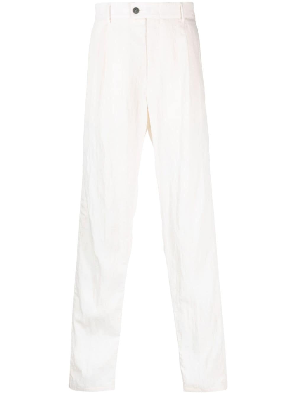 crinkled-finish straight-leg trousers Highlights - Cream white - Crinkled finish - Concealed fly and button fastening - Straight leg - Belt loops - Two side inset pockets - Two rear jetted pockets - Straight hem Made in Italy Composition Viscose 77%, Polyamide 23% SIZE & FIT Model measurements Height 6 ft 1 in(1.86 m) Bust/Chest 37.4 in(95 cm) Hips 36.22 in(92 cm) Waist 29.52 in(75 cm) Measurement FRONT RISE 12.2 in(31 cm) INSIDE LEG 33.85 in(86 cm) WAIST 38.58 in(98 cm) FittingInformation Designed for a tapered leg, offering a loose unrestricted fit over the leg with a closer fit towards the ankle Made from a lightweight non-stretch fabric This piece fits true to size – take your usual size
