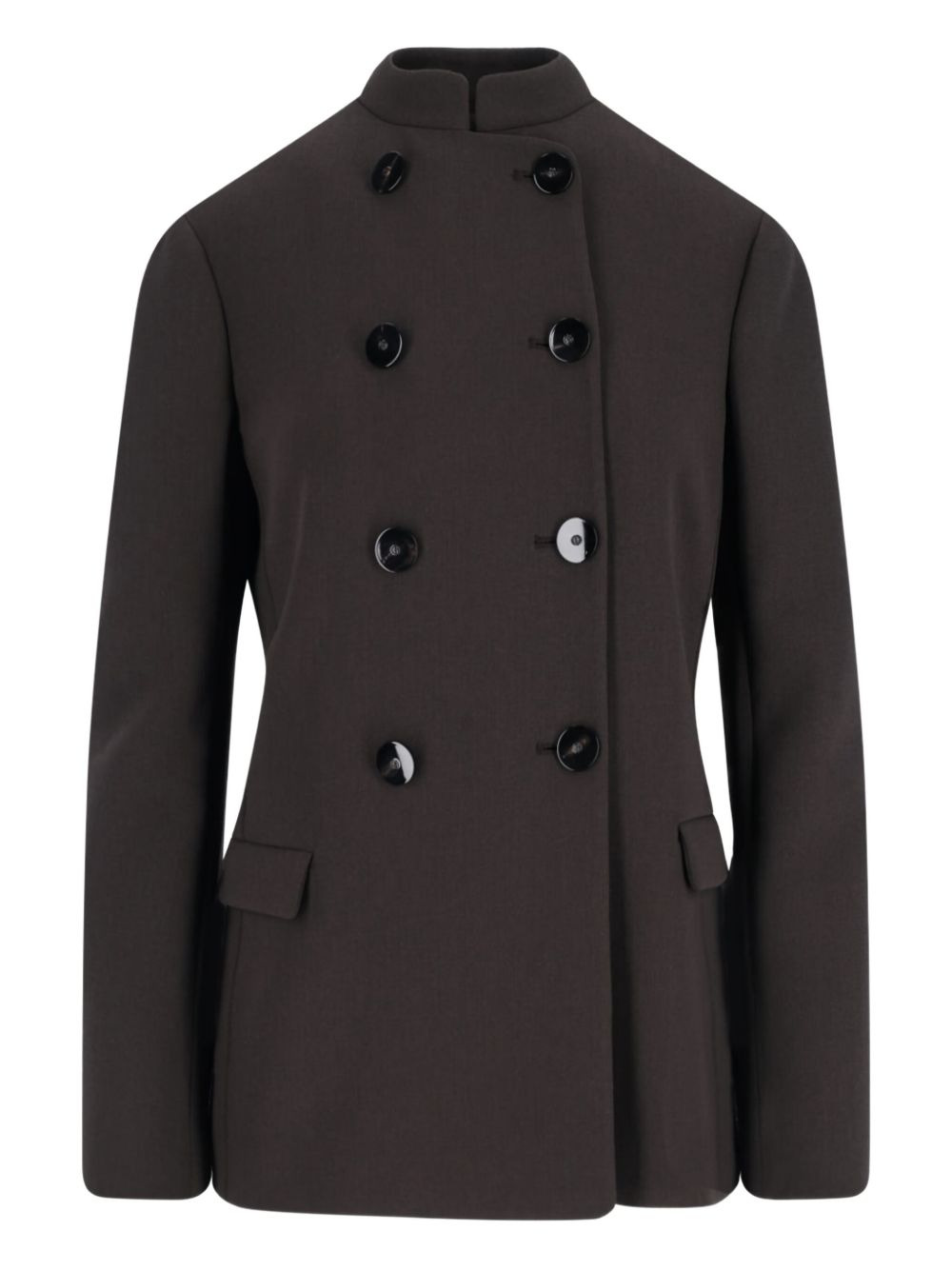 double-breasted button jacket Highlights - Brown - Double-breasted fastening - High neck - Long sleeves - Welt pocket - Button detailing Made in Italy Composition Virgin Wool 96%, Elastane 4% Washing instructions Read Manufacturer Guidelines