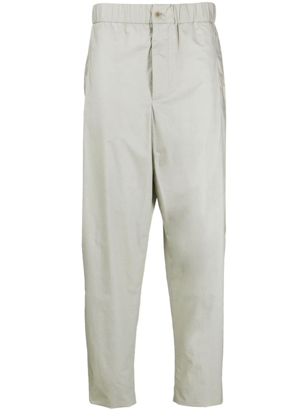elasticated-waist cotton trousers Highlights - Light grey - Cotton - Elasticated waistband - Button fly fastening - Tapered leg - Rear welt pocket - Two side inset pockets Made in Italy Composition Cotton 100% SIZE & FIT Model measurements Height 6 ft 2 in(1.87 m) Bust/Chest 36.41 in(92.5 cm) Hips 37 in(94 cm) Waist 29.52 in(75 cm) FittingInformation Designed for a tapered leg, offering a loose unrestricted fit over the leg with a closer fit towards the ankle The elasticated waist allows for a comfortable fit Made from a midweight non-stretch fabric This piece fits true to size – take your usual size