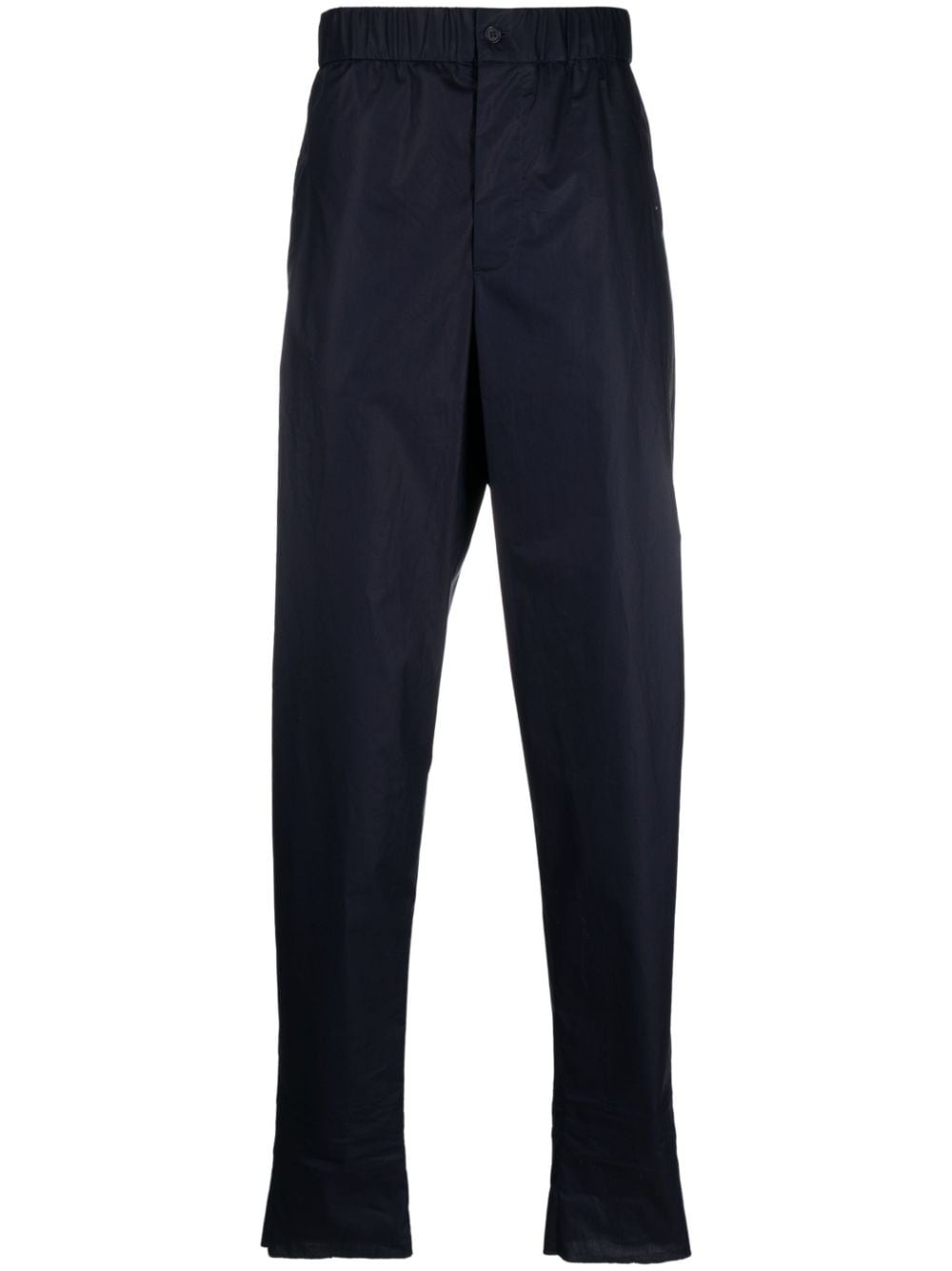 elasticated-waist cotton trousers Highlights - Navy blue - Cotton - Elasticated waistband - Pleat detailing - Button fly fastening - Rear welt pocket - Two side inset pockets Made in Italy Composition Cotton 100% SIZE & FIT Model measurements Height 6 ft 1 in(1.85 m) Bust/Chest 35.82 in(91 cm) Hips 37.79 in(96 cm) Waist 29.13 in(74 cm) FittingInformation Designed for a tapered leg, offering a loose unrestricted fit over the leg with a closer fit towards the ankle The elasticated waist allows for a comfortable fit Made from a lightweight non-stretch fabric This piece fits true to size – take your usual size