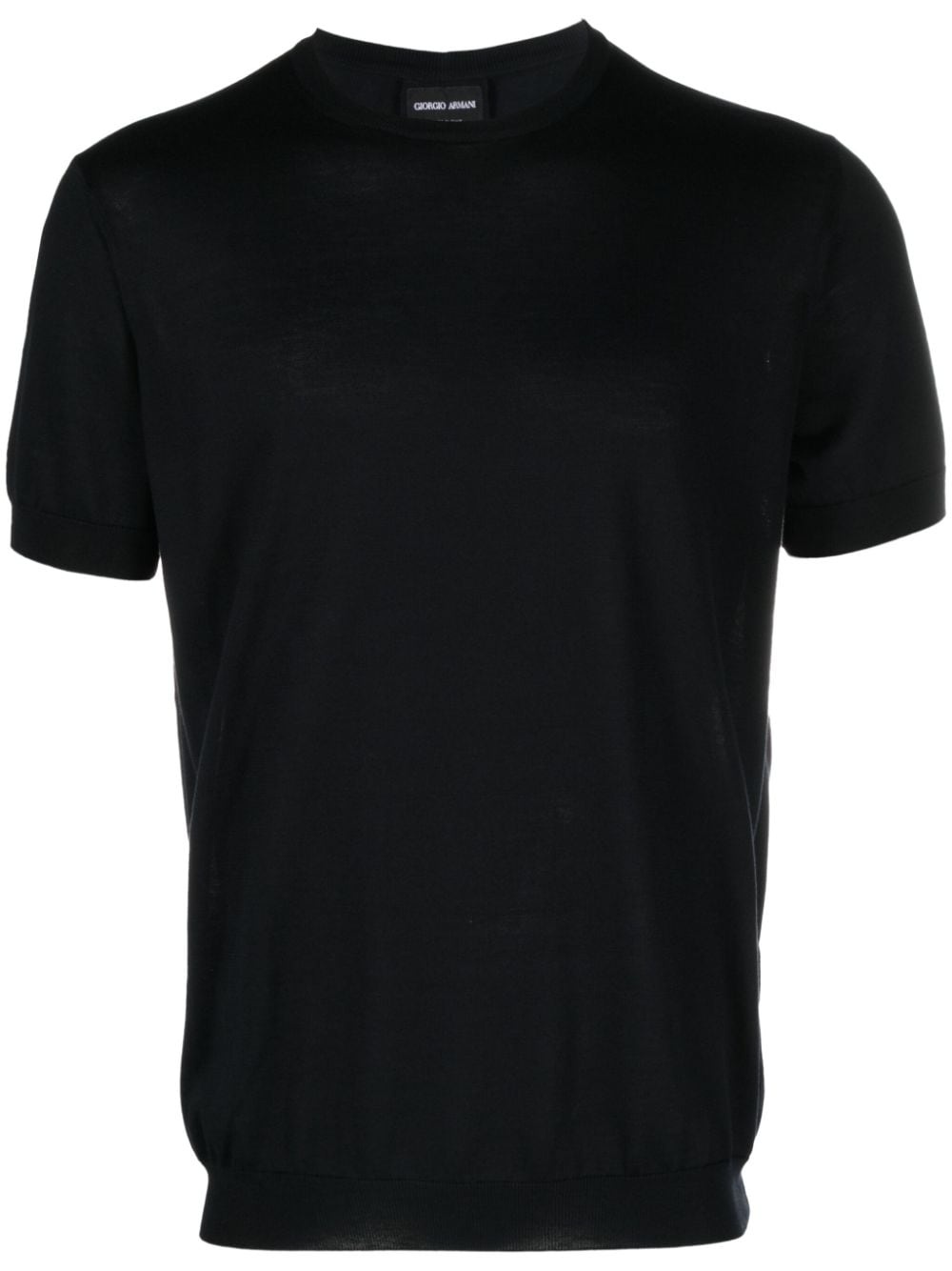 fine-knit T-shirt Highlights - Midnight blue - Cotton-silk blend - Fine knit - Crew neck - Short sleeves - Ribbed cuffs and hem Made in Italy Composition Silk 58%, Cotton 42% SIZE & FIT Model measurements Height 6 ft 2 in(1.87 m) Bust/Chest 36.41 in(92.5 cm) Hips 35.43 in(90 cm) Waist 29.52 in(75 cm) FittingInformation Designed for a regular fit, offering a comfortable loose fit throughout the body Made with a midweight knit, this piece offers some stretch This piece fits true to size – take your usual size Washing instructions Hand Wash