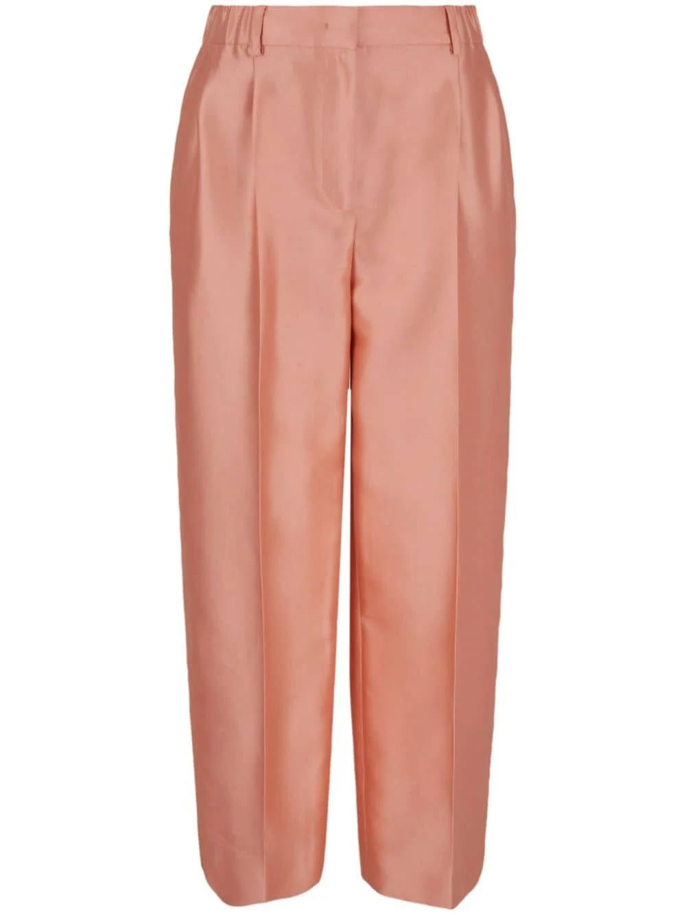 high-waisted cropped silk trousers Highlights - Light orange - Silk - Tonal stitching - Pleat detailing - Pressed crease - Belt loops - Concealed front fastening - Rear elasticated waistband - High-waisted - Straight leg - Two side slash pockets - Two rear welt pockets - Cropped Imported Composition Silk 100% Washing instructions Read Manufacturer Guidelines