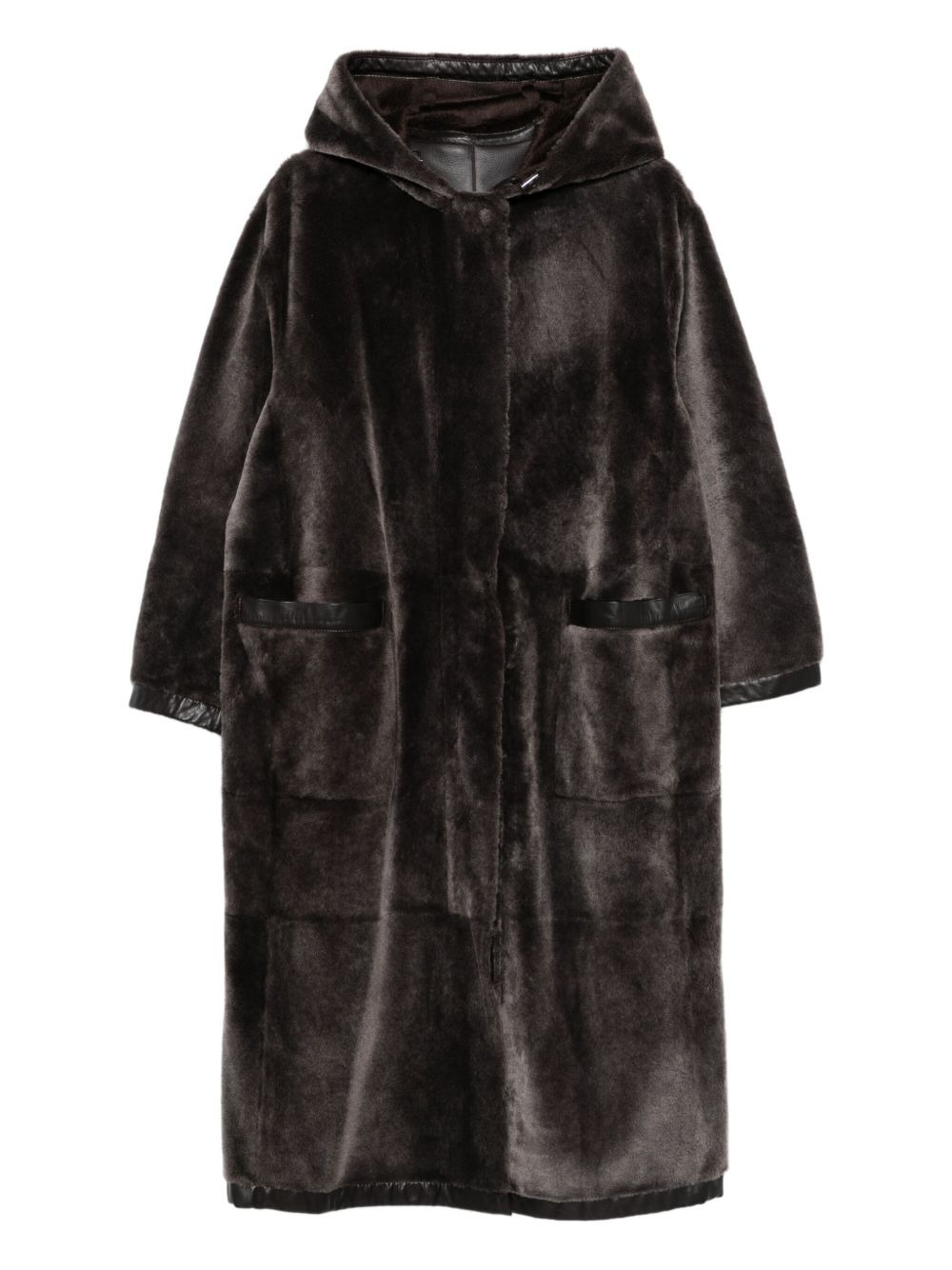 hooded pocketed coat Highlights - Brown - Classic hood - Front pockets - Long sleeves - Leather trim Imported Composition Lamb Shearling 100%, Calf Leather 100%, Alpaca Wool 75%, Virgin Wool 25% Washing instructions Read Manufacturer Guidelines