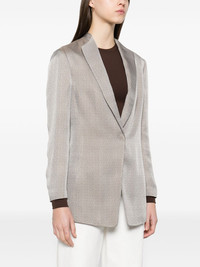 jacquard blazer Highlights - Nickel grey - Front button fastening - Two side slash pockets - English rear vents - Long sleeves Made in Italy Composition Silk 100%, Viscose 62%, Cupro 38% SIZE & FIT Model measurements Height 5 ft 10 in(1.78 m) Bust/Chest 33.85 in(86 cm) Hips 36.61 in(93 cm) Waist 26.77 in(68 cm) FittingInformation Designed for a slim fit that sits just away from the body offering a close yet comfortable fit The vented hem offers movement at the rear Made from a midweight non-stretch fabric