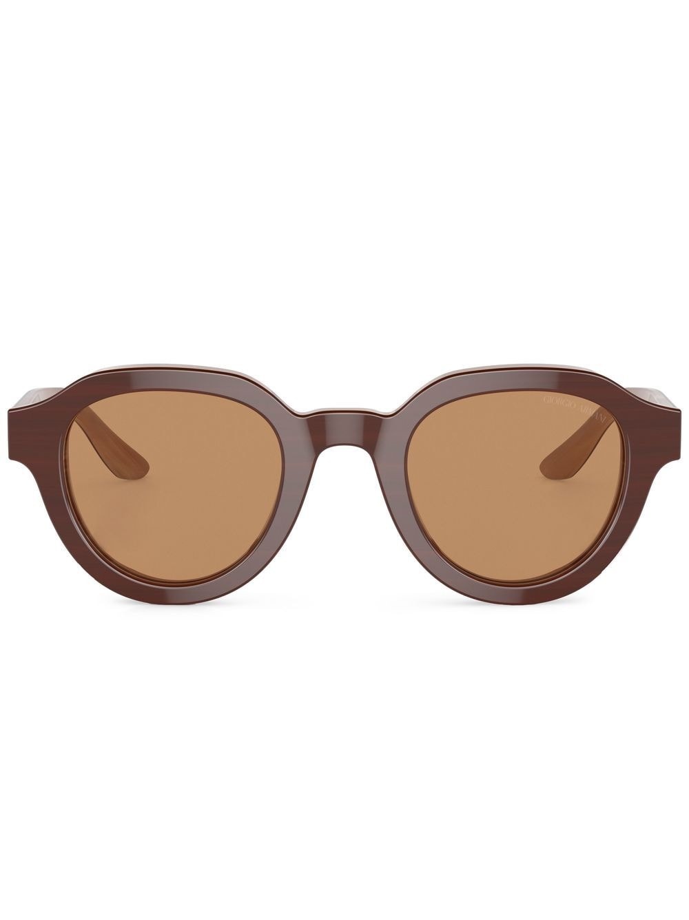 logo-print round-frame sunglasses logo-print round-frame sunglasses from GIORGIO ARMANI featuring logo print to the front, brown tinted lenses, UV-protective lenses, round frame, straight arms, curved tips and brown. All glasses from FARFETCH are sold as non-prescription frames.. These glasses come with a protective case.. Made in United States Composition Acetate 100%
