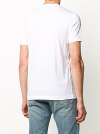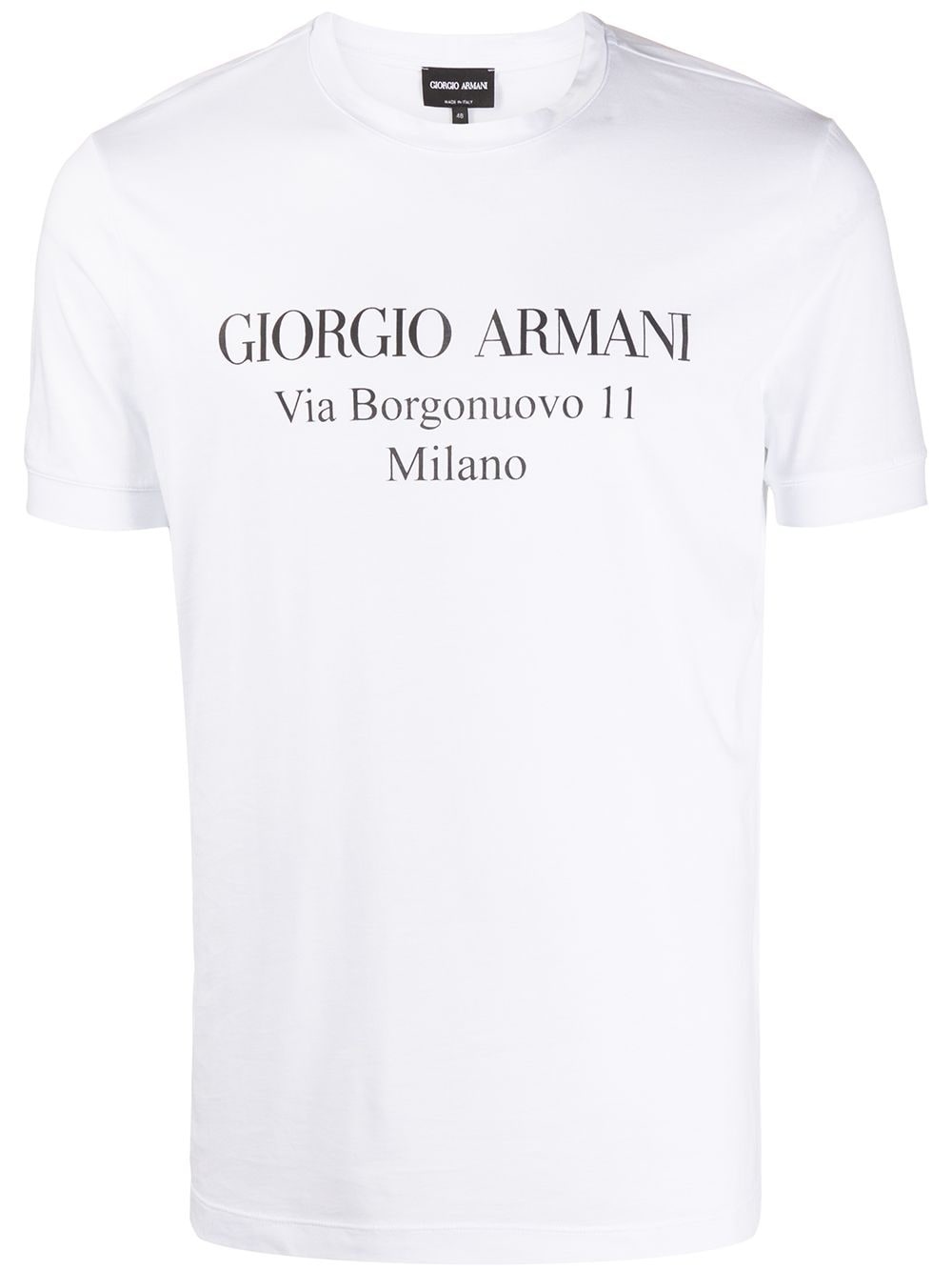 logo print T-shirt White cotton logo print T-shirt from Giorgio Armani featuring a round neck, short sleeves and a straight hem. Made in Italy Composition Cotton 100% SIZE & FIT Model measurements Height 6 ft 2 in(1.87 m) Bust/Chest 37.79 in(96 cm) Hips 37.79 in(96 cm) Waist 30.31 in(77 cm) Measurement Shoulder Width 18.5 in(47 cm) FittingInformation This piece fits true to size. We recommend you get your regular size Cut for a relaxed fit Made with a mid-weight fabric