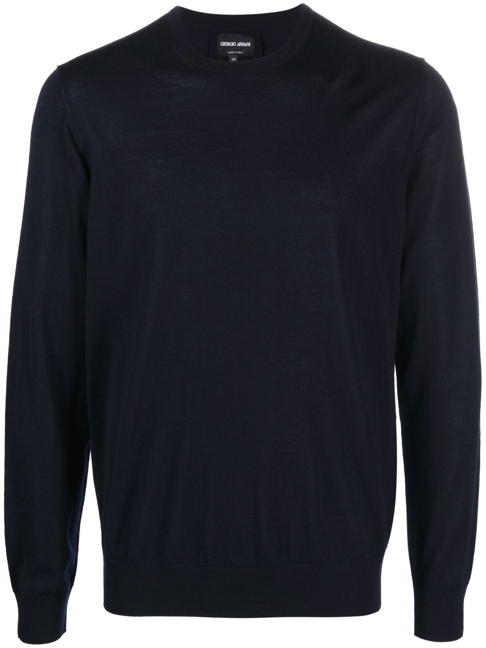 round-neck jumper navy blue virgin wool round neck knitted construction long sleeves straight hem Made in Italy Composition Virgin Wool 100% SIZE & FIT Model measurements Height 6 ft 2 in(1.89 m) Bust/Chest 37.79 in(96 cm) Hips 37 in(94 cm) Waist 29.92 in(76 cm) FittingInformation This piece fits true to size. We recommend you get your regular size Cut for a relaxed fit Made with a mid-weight fabric