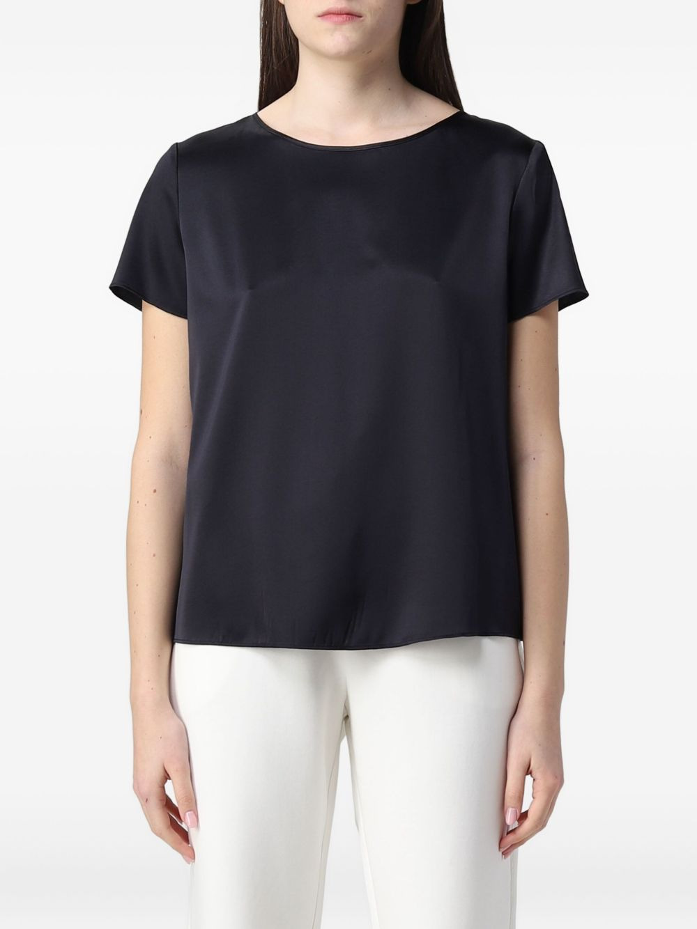 satin top Highlights - Black - Short sleeves - Crew neck - Rear button fastening Imported Composition Mulberry Silk 94%, Elastane 6% Washing instructions Read Manufacturer Guidelines