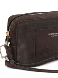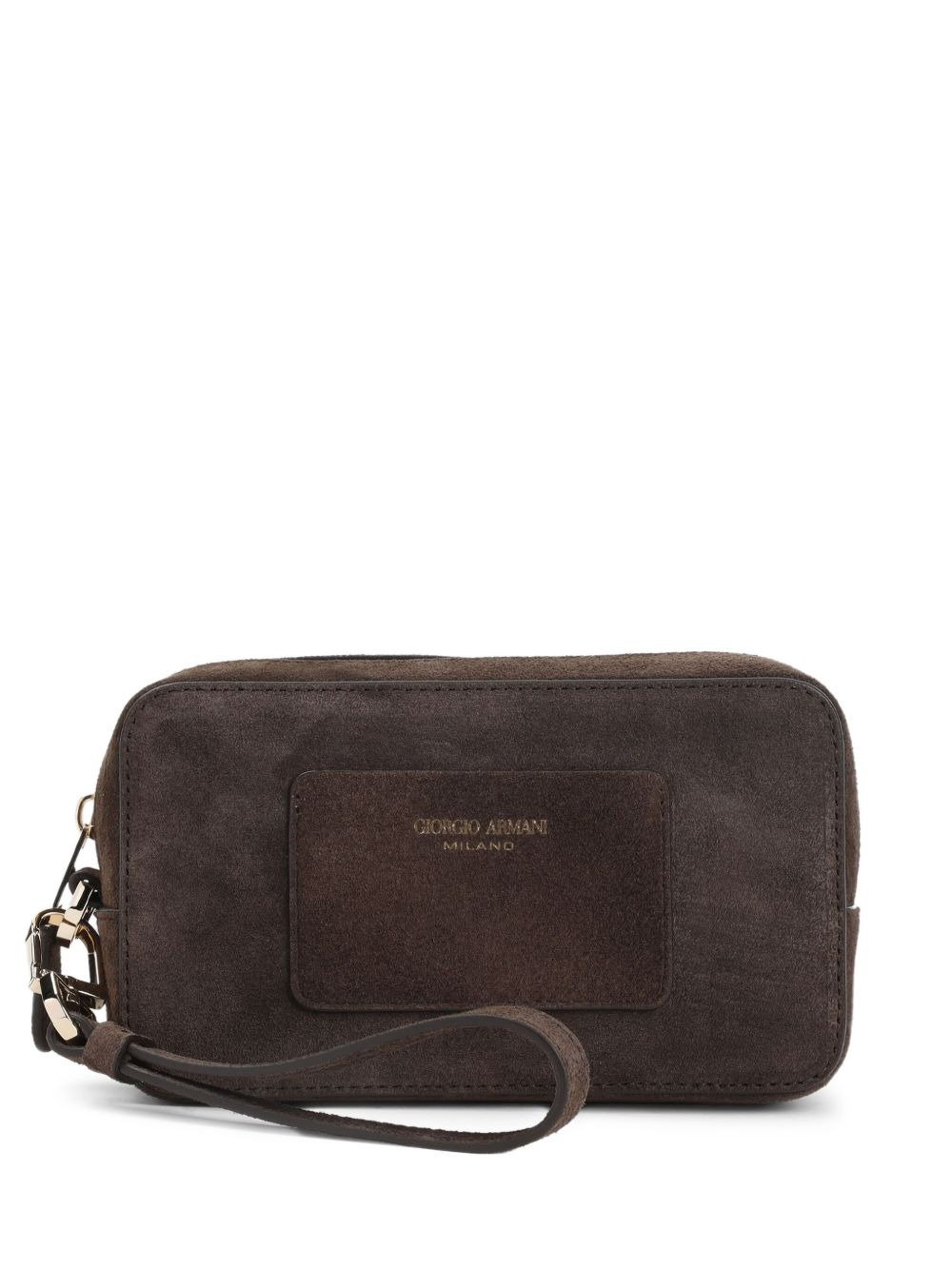 suede logo-patch clutch bag Highlights - Brown - Suede - Zip fastening - Logo patch - Wrist strap - Rectangular shape Made in Italy Composition Outer: Suede 100% Lining: Fabric 100%