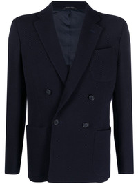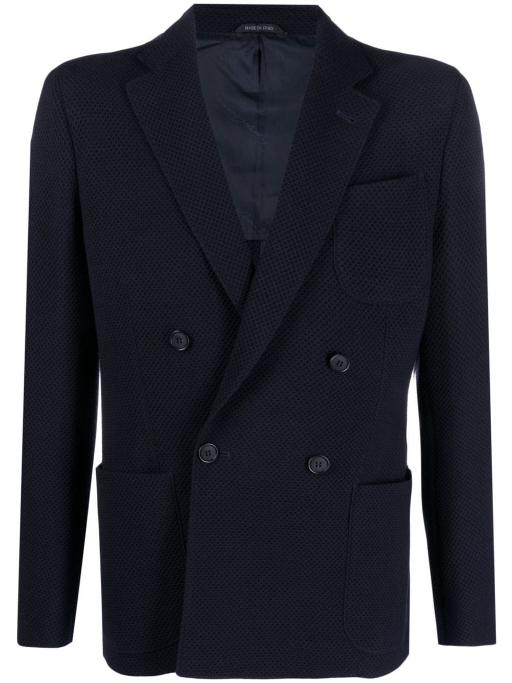 Upton double-breasted blazer Highlights - Navy blue - Virgin wool blend - Notched lapels - Double-breasted button fastening - Long sleeves - Buttoned cuffs - Chest welt pocket - Two side patch pockets - English rear vents - Straight hem Made in Italy Composition Virgin Wool 98%, Spandex/Elastane 2% SIZE & FIT Model measurements Height 6 ft 1 in(1.86 m) Bust/Chest 37.4 in(95 cm) Hips 34.64 in(88 cm) Waist 29.13 in(74 cm) FittingInformation Designed for a slim fit, offering a comfortable fit that sits just away from the body The internal shoulder pads offer a structured shape Made from a midweight stretch fabric, this piece offers elasticity and flexibility when worn This piece fits true to size – take your usual size Measurement CHEST 41.73 in(106 cm) SLEEVE LENGTH 25.19 in(64 cm) LENGTH 29.13 in(74 cm) WAIST 39.37 in(100 cm)