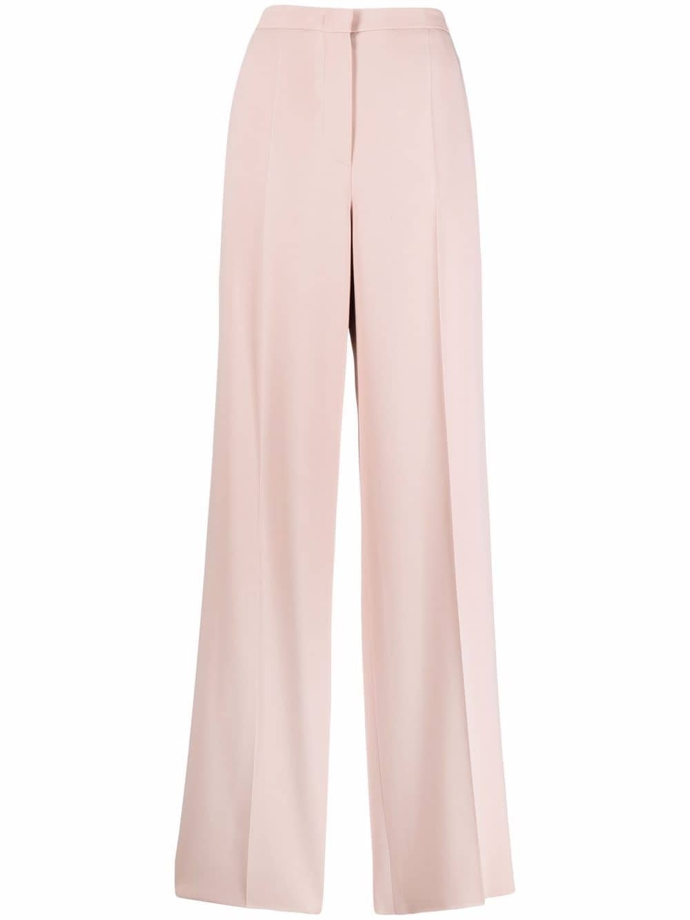 wide-leg trousers Giorgio Armani's expert Italian craftsmanship is evident in these tailored wide leg trousers from the brand's SS22 collection. Presented in a versatile pale pink hue, they feature a central pressed crease and concealed hook and zip fly closure. Made in Italy Composition Viscose 96%, Spandex/Elastane 4% SIZE & FIT Model measurements Height 5 ft 10 in(1.77 m) Bust/Chest 34.64 in(88 cm) Hips 35.43 in(90 cm) Waist 24.8 in(63 cm) FittingInformation This piece fits true to size. We recommend you get your regular size Designed to be fitted at the waist and hips, loose over the leg Made with a mid-weight stretch fabric