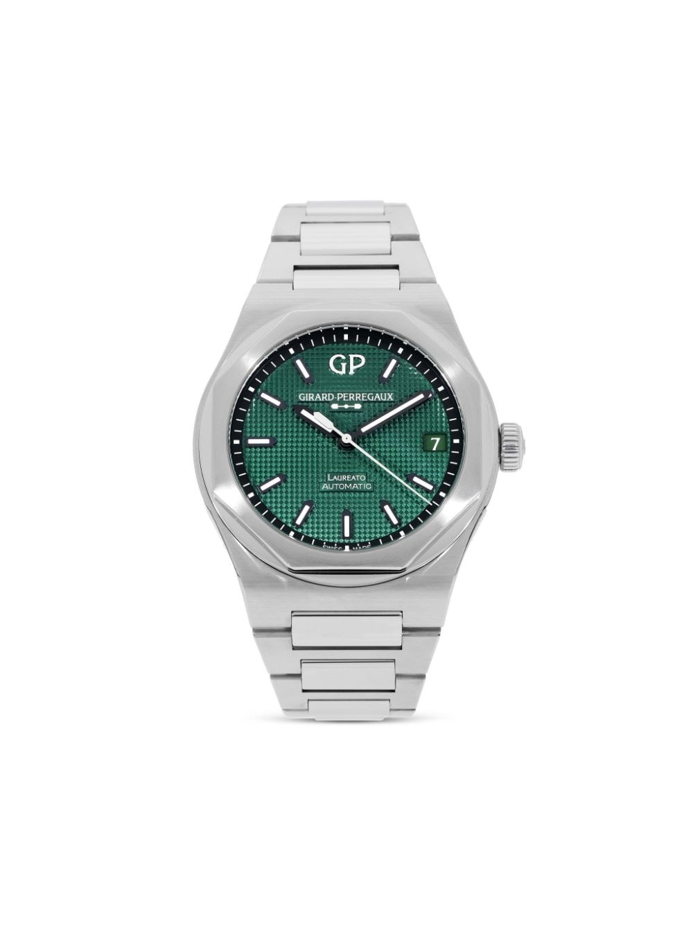 2022 unworn Girard Perregaux Laureato 42mm Highlights - 2022 - 42mm - Green - Luminescent dial - Index dial - Index hands - Stainless steel case - Stainless steel link bracelet - Automatic movement - Sapphire-crystal glass - Screw-down crown - Date indication - Water-resistant - Cosc chronometer certificate - Folding clasp - This piece is new and unworn. - All repairs of the movement of the watch and the repairs of water-resistant watches with water damage are covered by the boutique two-year warranty. - Original box, papers and boutique certificate included. - An inspection by the boutique-certified watchmakers guarantees authenticity. Imported Composition stainless steel 100% SIZE & FIT Measurement Case size 1.65 in(42 mm)