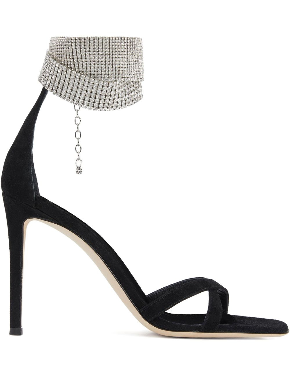 105mm Janell crystal sandals Highlights - Black - Crystal embellishment - Ankle strap - Chain detail - Stiletto heel - Open toe Made in Italy Composition Outer: Suede 100% Sole: Leather 100% Lining: Leather 100% SIZE & FIT Measurement HEEL 4.13 in(10.5 cm)