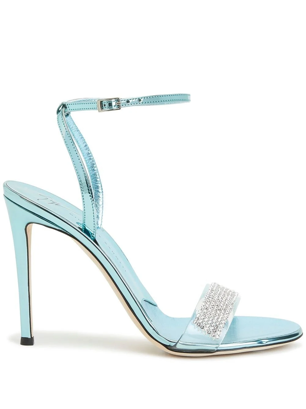 105mm Erwan sandals Highlights - Light blue - Leather - Rhinestone embellishment - Open toe - Single toe strap - Buckle-fastening ankle strap - High stiletto heel Made in Italy Composition PVC 100% SIZE & FIT Measurement HEEL 4.13 in(10.5 cm)