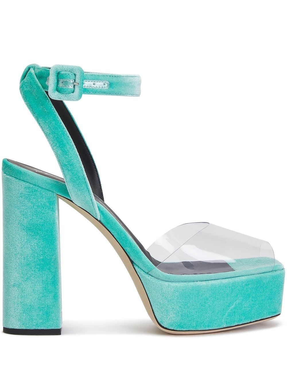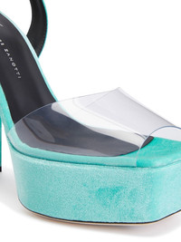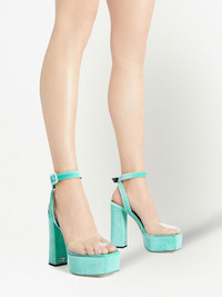 120mm New Betty Plexi sandals Highlights - Teal blue - Leather lining - Velvet effect - Transparent design - Branded insole - Open toe - Buckle-fastening ankle strap - High block heel Made in Italy Composition PVC 100% SIZE & FIT Measurement HEEL 4.72 in(12 cm) PLATFORM 1.57 in(4 cm)