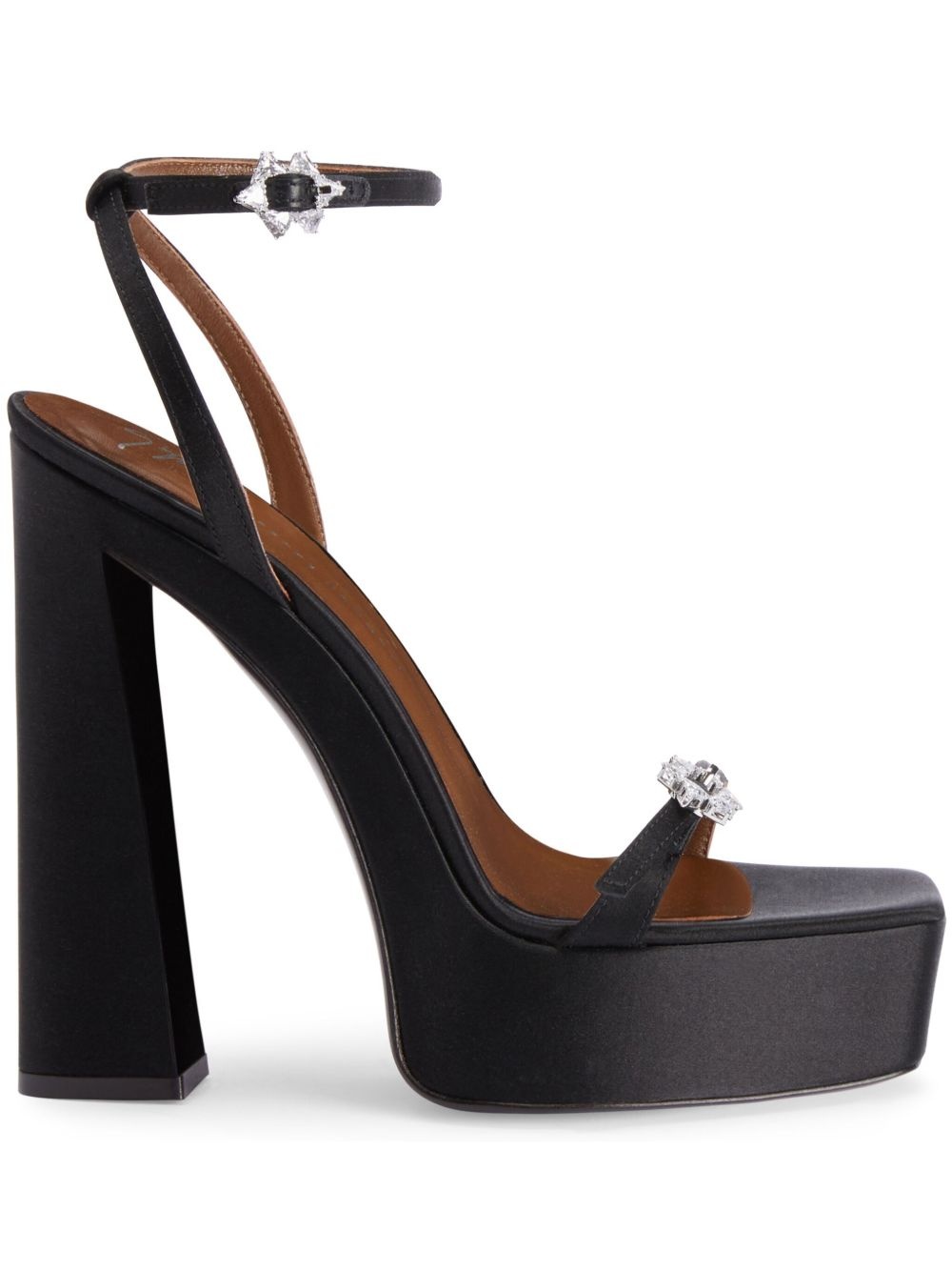 145mm Himari Wedge sandals Highlights - Black - Buckle-fastening ankle strap - Rhinestone embellishment - Platform sole - High block heel Made in Italy Composition Sole: Leather 100% Lining: Calf Leather 100% Outer: Satin 100% SIZE & FIT Measurement HEEL 5.7 in(14.5 cm)