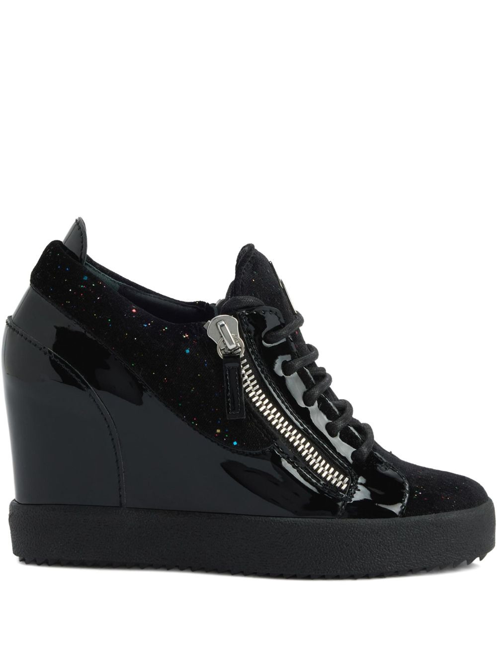 Addy Wedge glitter-panel sneakers Highlights - Black - Patent leather - Wedge heel - Zip fastening - Lace-up closure - Glitter-embellished suede panel Made in Italy Composition Sole: Rubber 100% Outer: Polyurethane 100% Lining: Fabric 100%