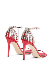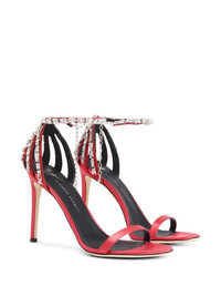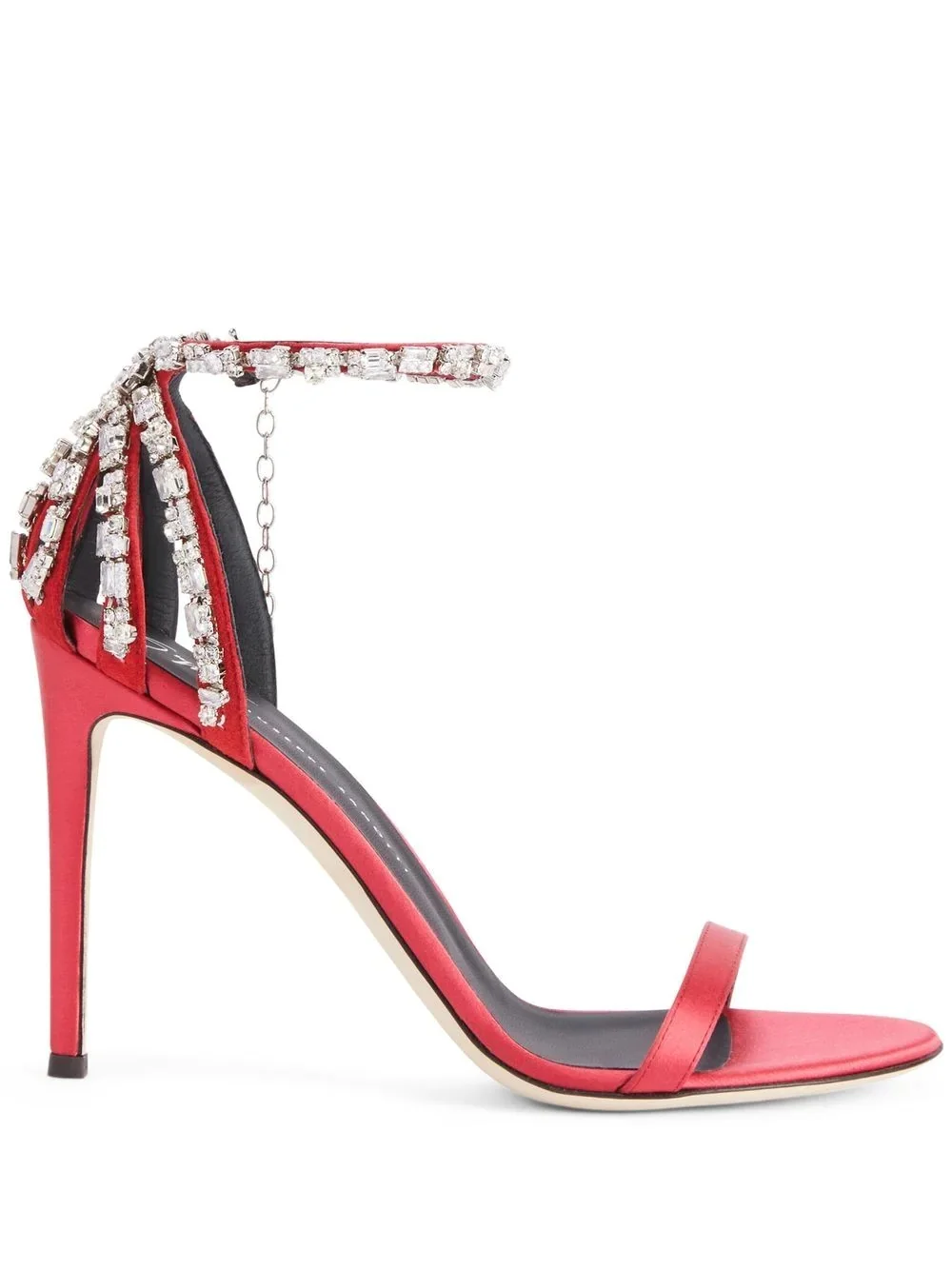 Adele crystal 105mm sandals dark red leather/suede satin finish almond toe single toe strap branded insole crystal embellishment ankle-length 105mm heel Made in Italy Composition Outer: Satin 100% Sole: Leather 100% Lining: Leather 100% Trims: Suede 100% SIZE & FIT Measurement HEEL 4.13 in(10.5 cm)