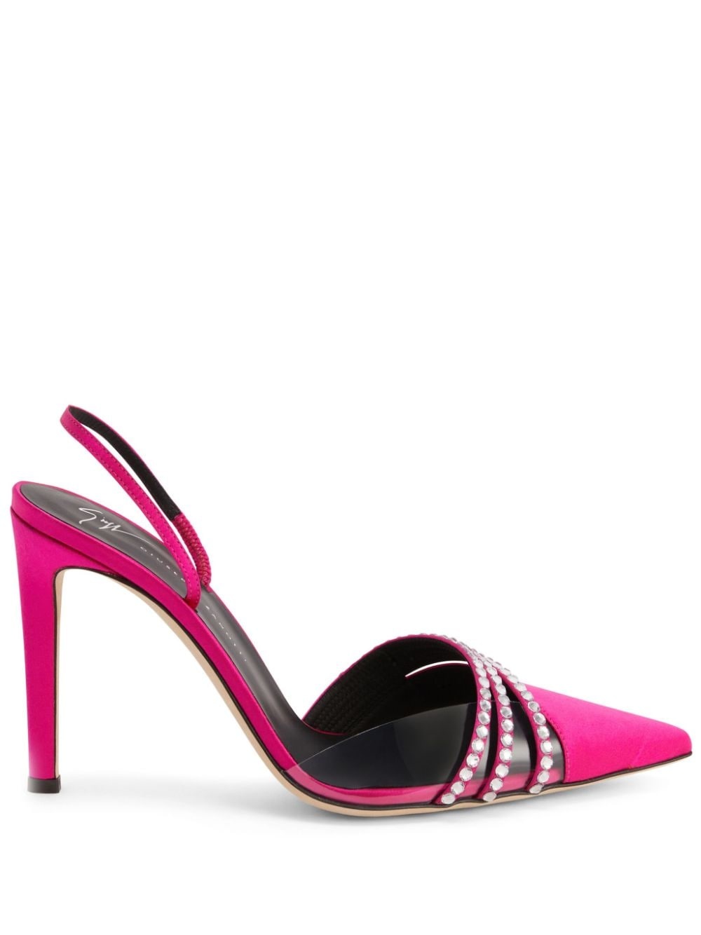 Audrine 105mm leather pumps Highlights - Fuchsia pink - Calf leather - Crystal embellishment - Pointed toe - Elasticated strap - Branded leather insole - High heel Made in Italy Composition Outer: Satin 100% Sole: Leather 100% Lining: Calf Leather 100% SIZE & FIT Measurement HEEL 4.33 in(11 cm) Sole height 0.39 in(1 cm)