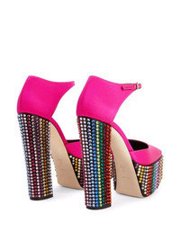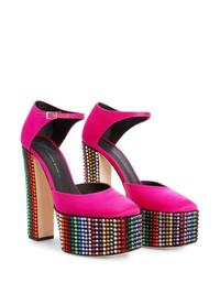 Bebe Strass studded platform sandals Highlights - Pink/multicolour satin/leather bebe strass studded platform sandals from giuseppe zanotti featuring stud embellishment, almond toe, buckle-fastening ankle strap, platform sole and high block heel. Made in Italy Composition Outer: Satin 100% Sole: Leather 100% Lining: Leather 100% SIZE & FIT Measurement HEEL 5.9 in(15 cm) PLATFORM 2.36 in(6 cm)