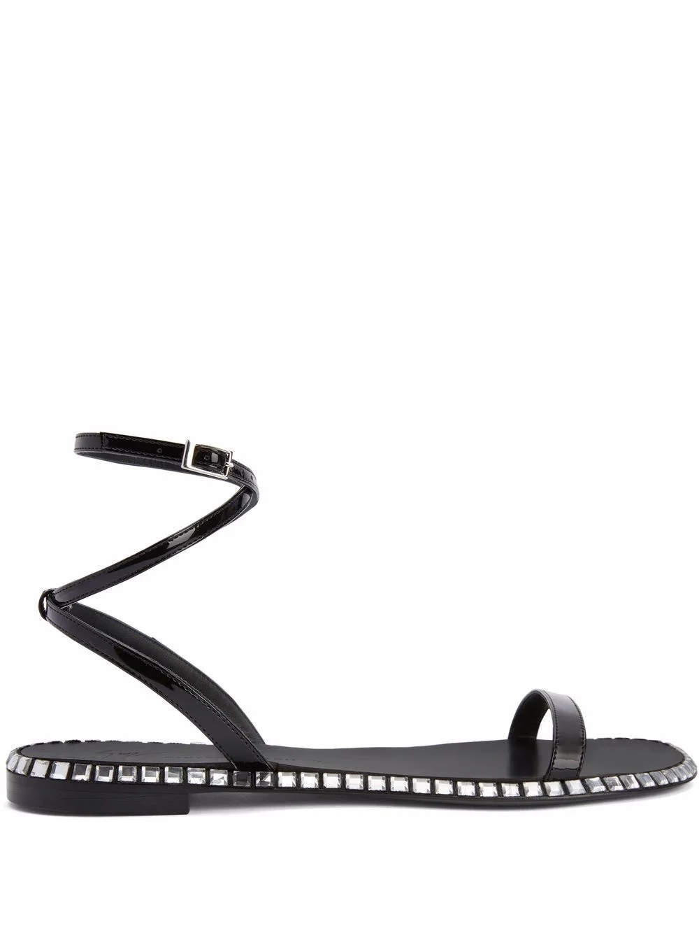 Bellatriks flat sandals Giuseppe Zanotti is an Italian footwear and fashion designer, master in combining different details to create new and sleek designs. A fine example is the Bellatriks sandal, crafted from black leather and detailed with a sole embellished with crystal-coloured rhinestones around the edge. Made in Italy Composition Other fibres 100% SIZE & FIT Measurement HEEL 0.39 in(1 cm)