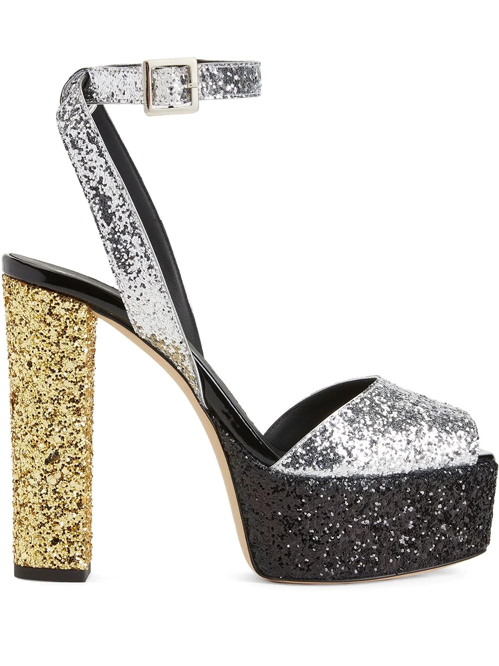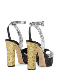 120mm Betty Glitter platform-sole sandals The Betty sandals from Giuseppe Zanotti exude a maximalist appeal. The shimmering pair is decorated with glitter throughout, in shades of silver, gold and black for a dramatic look. Highlights - Black/silver-tone/gold-tone - Leather - Glitter detailing - Panelled design - Open toe - Square toe - Buckle-fastening ankle strap - Branded leather insole - Platform sole - 140mm high-block heel - Leather sole Made in Italy Composition Other fibres 100%