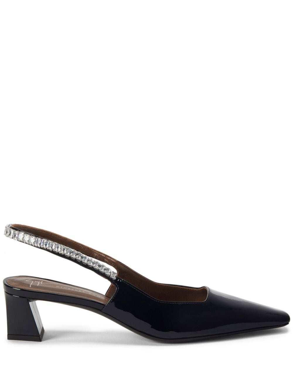 45mm Brendha Crystal pumps Highlights - Jet black - Calf leather - Patent finish - Crystal embellishment - Pointed toe - Slingback strap - Branded leather insole - Block heel - Leather sole Made in Italy Composition Outer: Leather 100% Sole: Leather 100% Lining: Calf Leather 100%