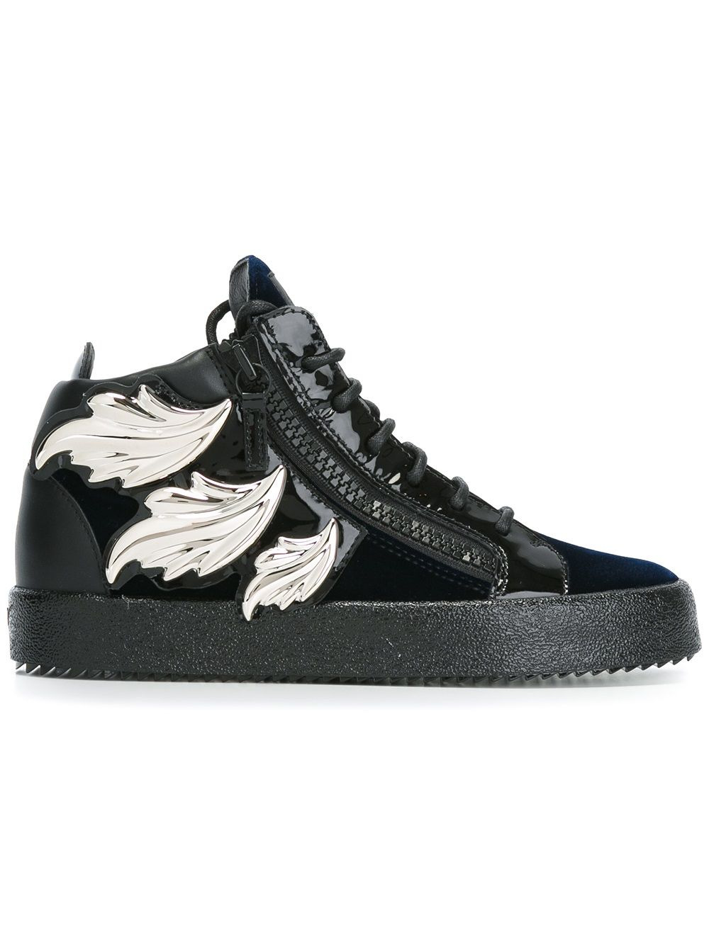 'Cruel' hi-top sneakers Black velvet and patent leather 'Cruel' hi-top sneakers from Giuseppe Zanotti featuring an almond toe, a logo patch at the tongue, a lace-up front fastening, side zip fastenings, a flat rubber sole and an embossed leaf detail to the side. Made in Italy Composition Lining: Calf Leather 100% Sole: Rubber 100% Outer: Calf Leather 100%, Patent Leather 100%, Velvet 100% SIZE & FIT Measurement Sole height 1.18 in(3 cm) HEIGHT 3.14 in(8 cm)