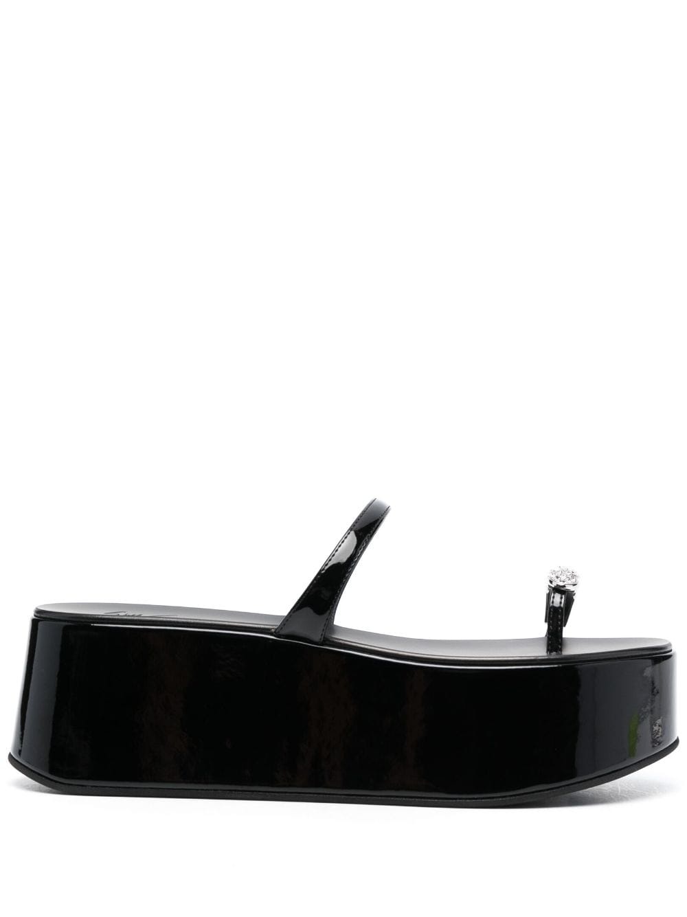 Crystal-embellished 70mm leather platform slides Highlights - Black - Calf leather - High-shine finish - Crystal embellishment - Single toe strap - Open toe - Slip-on style - Branded leather insole - Platform sole Made in Italy Composition Sole: Rubber 100% Outer: Calf Leather 100% Lining: Calf Leather 100% SIZE & FIT Measurement HEEL 2.75 in(7 cm) PLATFORM 2.16 in(5.5 cm)