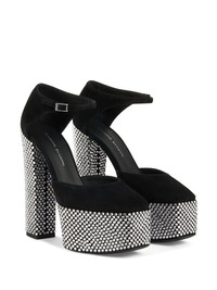 crystal-embellished platform sandals Black leather and suede crystal-embellished platform sandals from Giuseppe Zanotti featuring crystal embellishments, a square toe, an ankle strap with a side buckle fastening, a platform sole and a high block heel. Made in Italy Composition Outer: Suede 100%, Crystal 100% Sole: Leather 100% SIZE & FIT Measurement HEEL 5.9 in(15 cm) PLATFORM 2.75 in(7 cm)