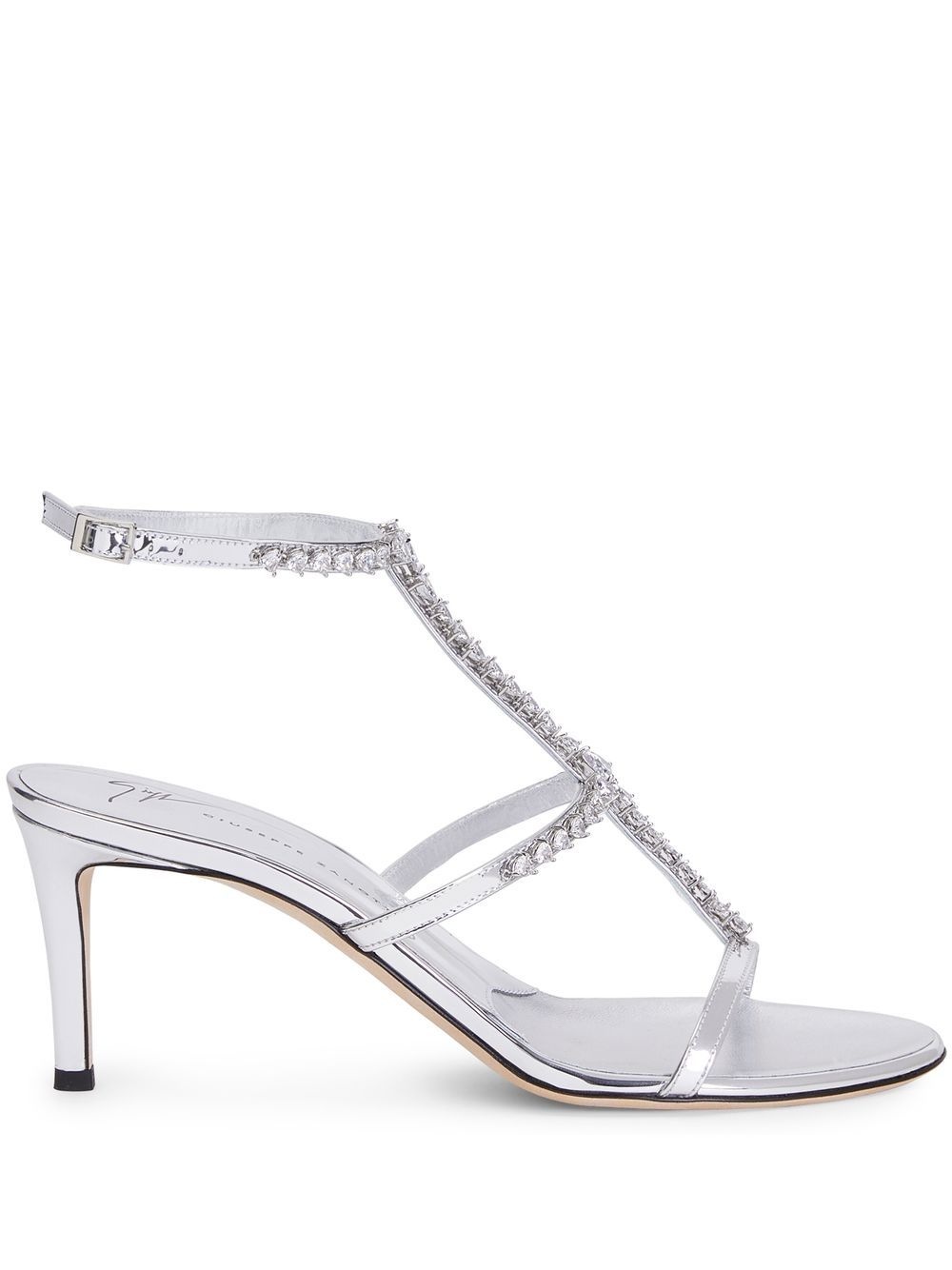 70mm Minnah sandals Highlights - Silver - Metallic effect - Crystal embellishment - Thin straps - Buckle-fastening ankle strap - High heel - Round toe - Branded insole Made in Italy Composition Other fibres 100% SIZE & FIT Measurement HEEL 2.75 in(7 cm)