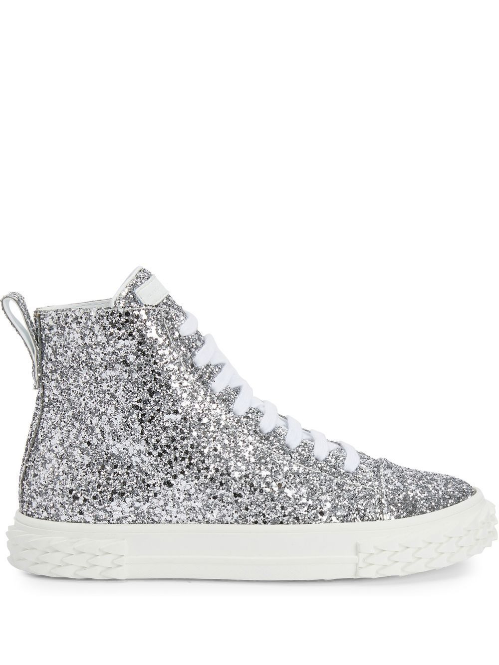 Eco-Blabber high-top glitter sneakers Highlights - Silver - Recycled pet - Glitter detailing - Round toe - Front lace-up fastening - Ankle-length - Pull-tab at the heel - Flat rubber sole Made in Italy Composition Lining: Leather 100% Outer: Glitter 100%, Recycled PET 54%, Polyester 35%, Polyurethane 10%, Polyethylene Terephthalate (PET) 1% Sole: Rubber 100%