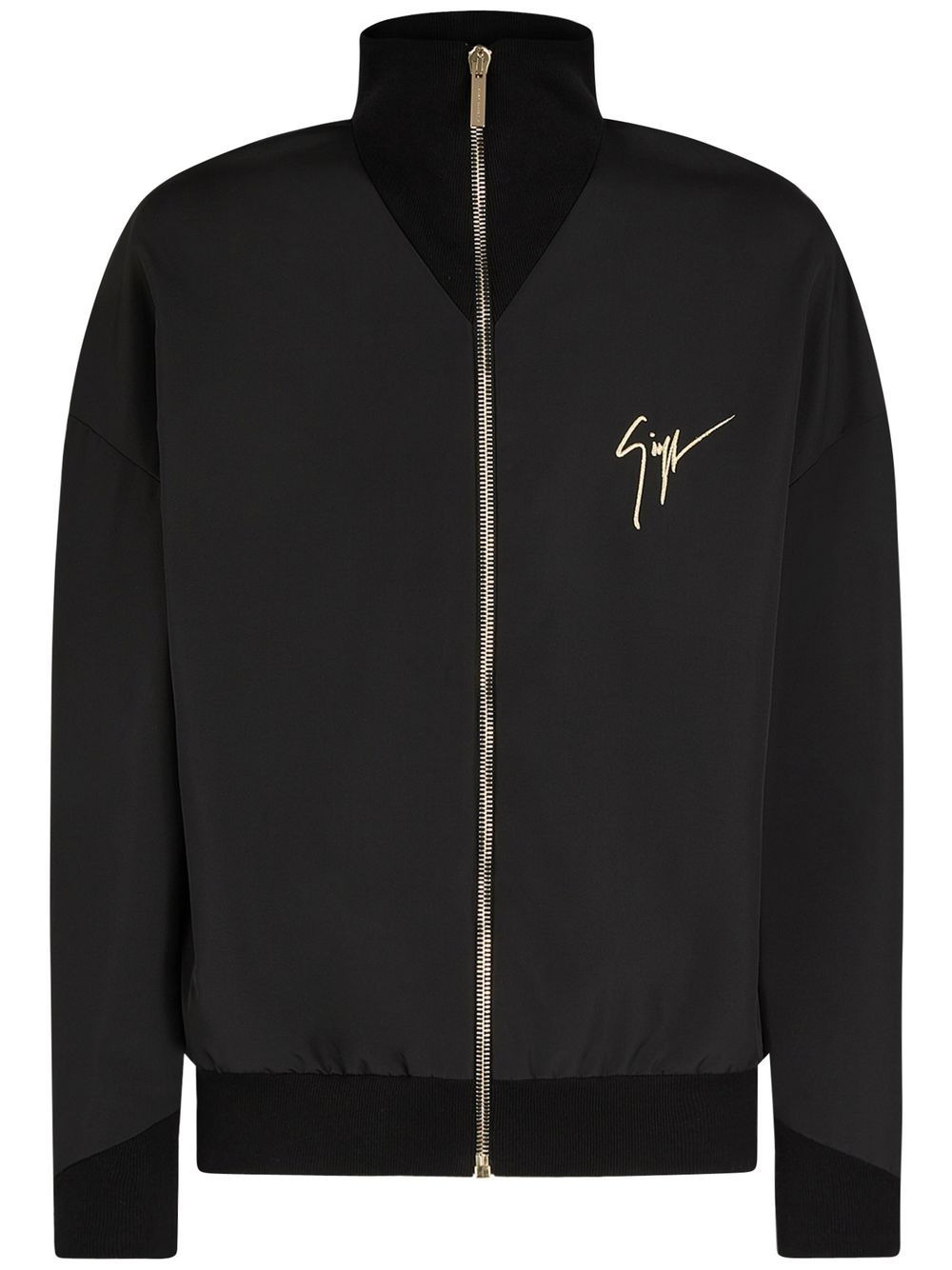 embroidered-logo zip-up bomber jacket black logo plaque high neck front zip fastening long sleeves fitted-cuff sleeves straight hem Made in Italy Composition Polyester 100%