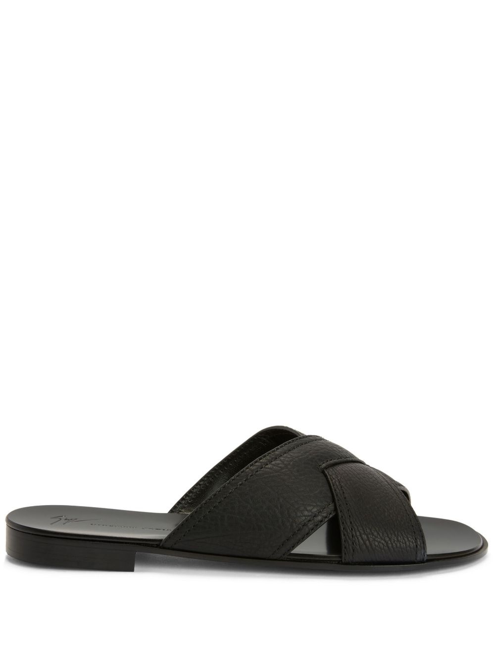 Flavio criss-cross leather sandals Highlights - Jet black - Leather - Criss-cross straps - Pebbled texture - Branded insole - Round open toe - Low block heel - Flat sole Made in Italy Composition Outer: Leather 100% Sole: Leather 100% Lining: Leather 100%