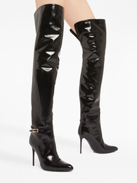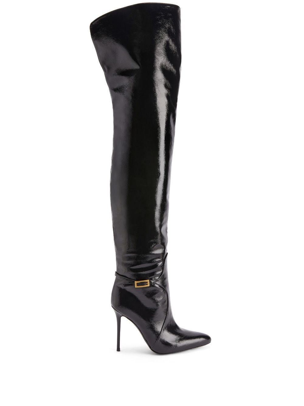 105mm Frannie High above-knee boots Highlights - Black - Leather - Gold-tone hardware - Decorative buckle detailing - Pointed toe - Above-knee length - Rear slit - 105mm stiletto heel Made in Italy Composition Outer: Fabric 100% Sole: Leather 100% SIZE & FIT Measurement HEEL 4.13 in(10.5 cm)