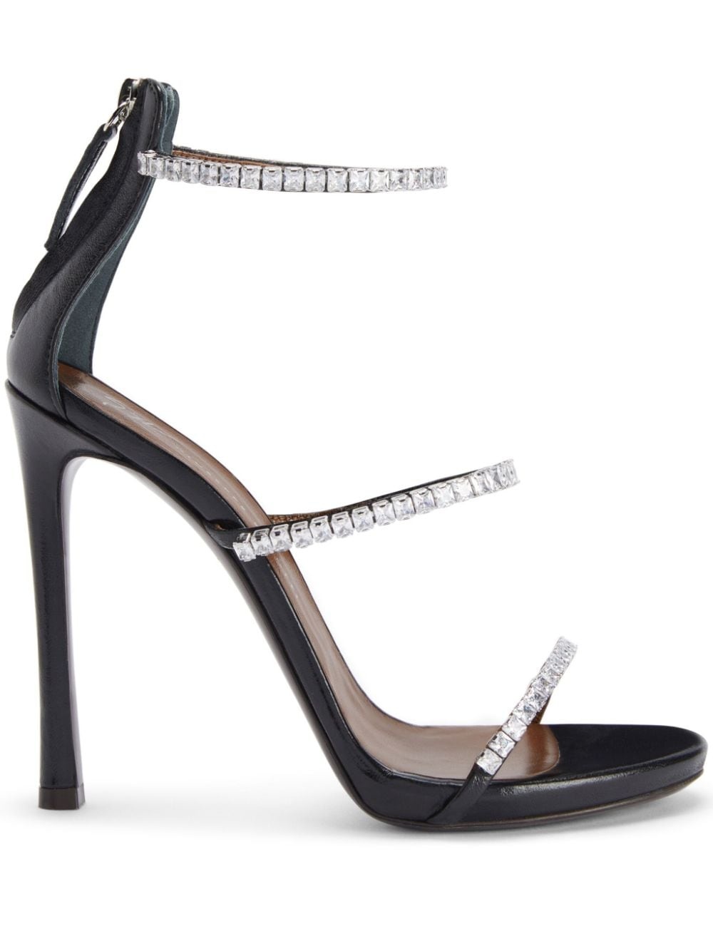 120mm Harmony Shine crystal-embellished sandals Highlights - Black - Calf leather - Crystal embellishment - Round open toe - Rear zip fastening - Branded footbed - 80mm stiletto heel - Leather sole Made in Italy Composition Outer: Leather 100% Sole: Leather 100% Lining: Calf Leather 100%