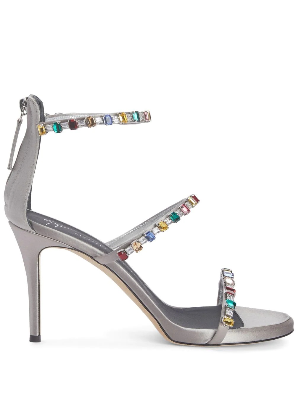 Harmony Diamond 100mm sandals ash grey/multicolour leather rhinestone embellishment open toe ankle strap rear zip fastening branded insole high 100mm stiletto heel Made in Italy Composition Outer: Fabric 100% Sole: Leather 100% Lining: Leather 100% SIZE & FIT Measurement HEEL 3.93 in(10 cm)