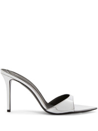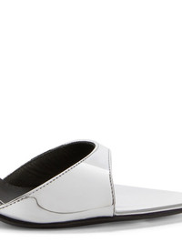 70mm Intriigo leather sandals Highlights - Silver-tone - Leather - Metallic effect - Mirrored finish - Single toe strap - Pointed toe - Slip-on style - Branded footbed - 70mm mid heel - Faux-leather sole Made in Italy Composition Other fibres 100% SIZE & FIT Measurement HEEL 3.93 in(10 cm)