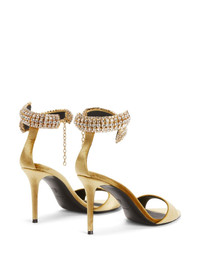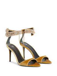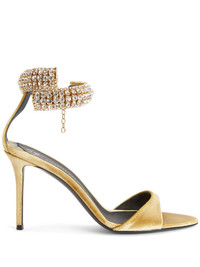 90mm Intriigo Bijoux velvet sandals Highlights - Gold-tone - Leather - Velvet effect - Rhinestone embellishment - Branded footbed - Open toe - Lobster claw fastening - 90mm stiletto heel Made in Italy Composition Sole: Leather 100% Outer: Velvet 100%, Fabric 100%, Rhinestone 100% SIZE & FIT Measurement HEEL 35.43 in(90 cm)
