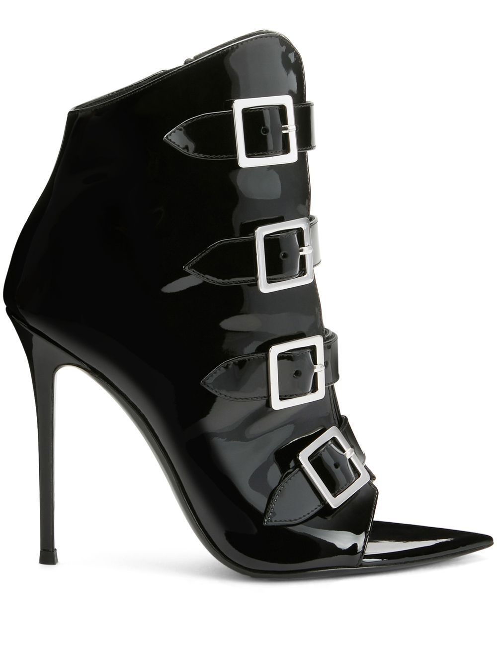 Intriigo Buckle 105mm boots black leather buckle detail at the toe side zip fastening peep toe pointed toe high stiletto heel Made in Italy Composition Other fibres 100%