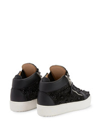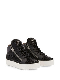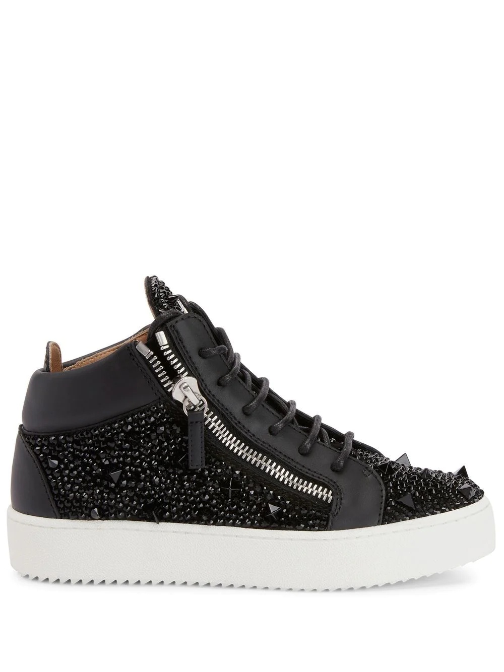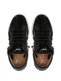 Kriss rhinestone-embellished sneakers Kriss rhinestone-embellished sneakers from Giuseppe Zanotti featuring black, leather, suede, rhinestone embellishment, stud detailing, logo plaque at the tongue, round toe, front lace-up fastening, decorative zip detailing and flat rubber sole. Made in Italy Composition Outer: Suede 100%, Leather 100%, Rhinestone 100% Sole: Rubber 100% Lining: Leather 100%