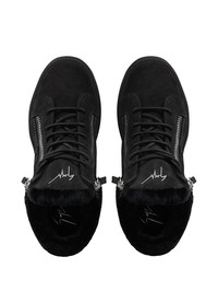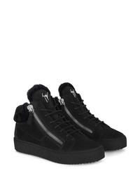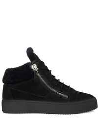 Kriss Winter sneakers Giuseppe Zanotti puts a contemporary spin on Italian luxury and traditional craftsmanship. The Kriss Winter sneakers have a mid-top look, faux fur lining and are detailed with silver-tone zips on either side of the lace-up fastening. Highlights - Black - Suede - Zip details - Logo patch at the tongue - Silver-tone hardware - Round toe - Front lace-up fastening - Faux-fur lining - Flat rubber sole Made in Italy Composition Suede 100%