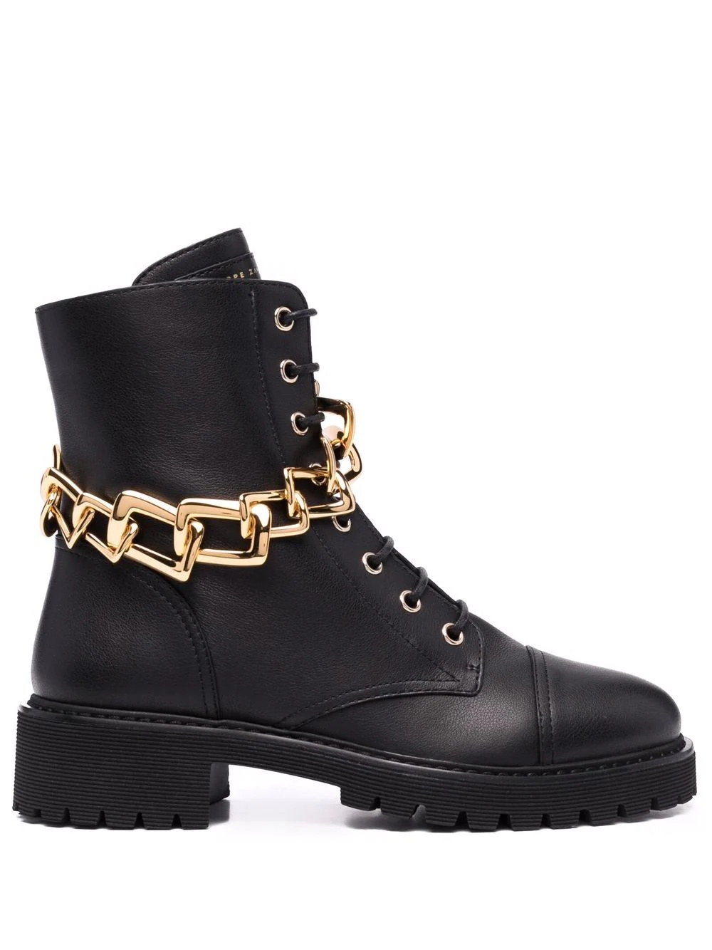 lace-up leather boots black leather leather lining chain-link trim round toe front lace-up fastening branded insole mid block heel rubber sole Made in Italy Composition Leather 100% SIZE & FIT Measurement HEEL 1.77 in(4.5 cm) HEIGHT 5.9 in(15 cm) Sole height 0.98 in(2.5 cm)